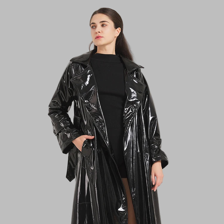 Abrigo de Cuero Negro Largo para Mujer Lacado Goth