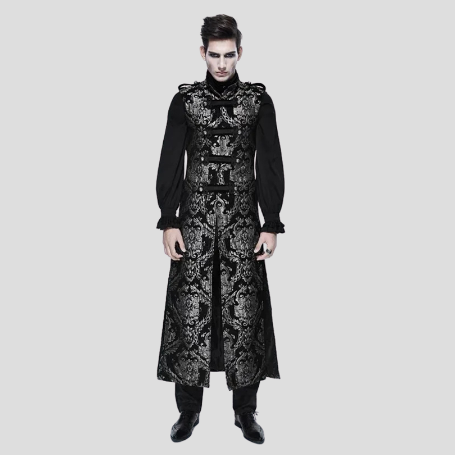 Abrigo Negro Steampunk Gótico con Diseño de Brocado y Correas