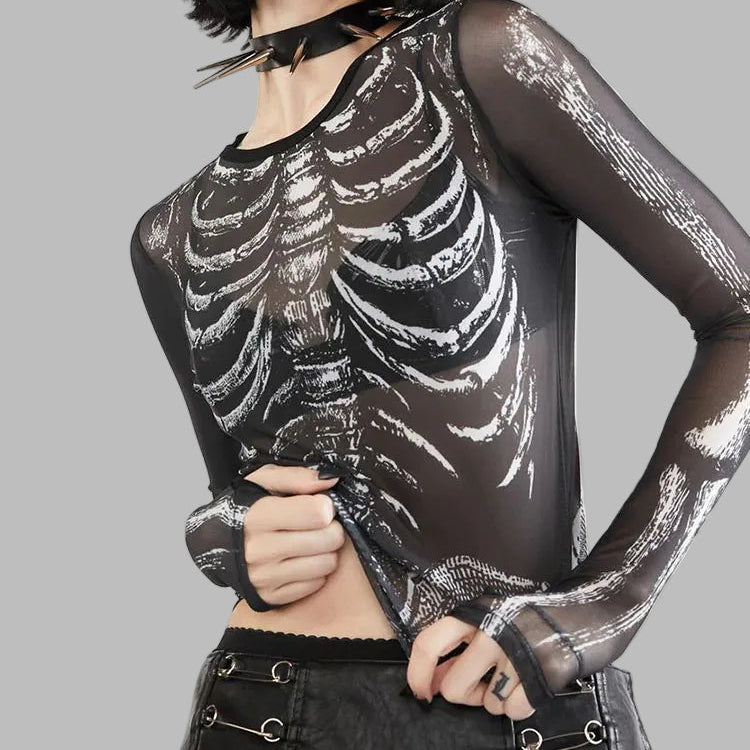 Blusa de Malla con Estampado de Esqueleto Punk Gótica para Mujer