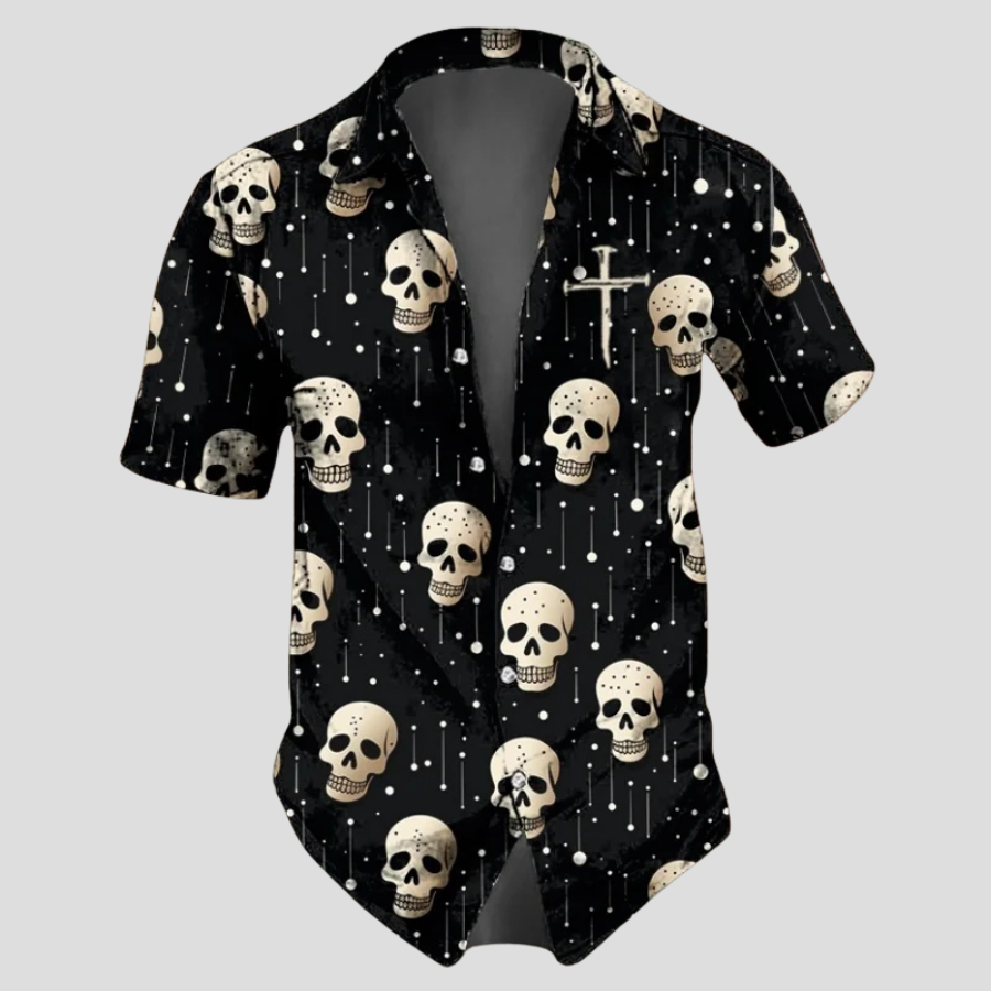 Camisa Punk Negra con Calaveras y Cruces de Manga Corta