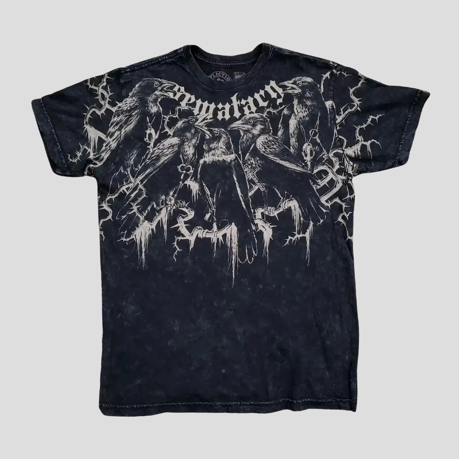 Camiseta Punk Metal Negra con Cuervos y Texto