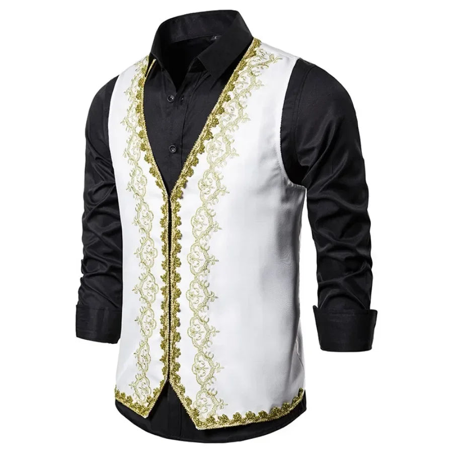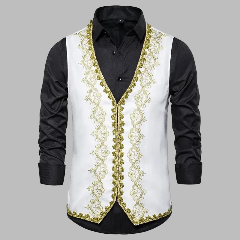 Chaleco Steampunk Elegante con Bordado Dorado Blanco