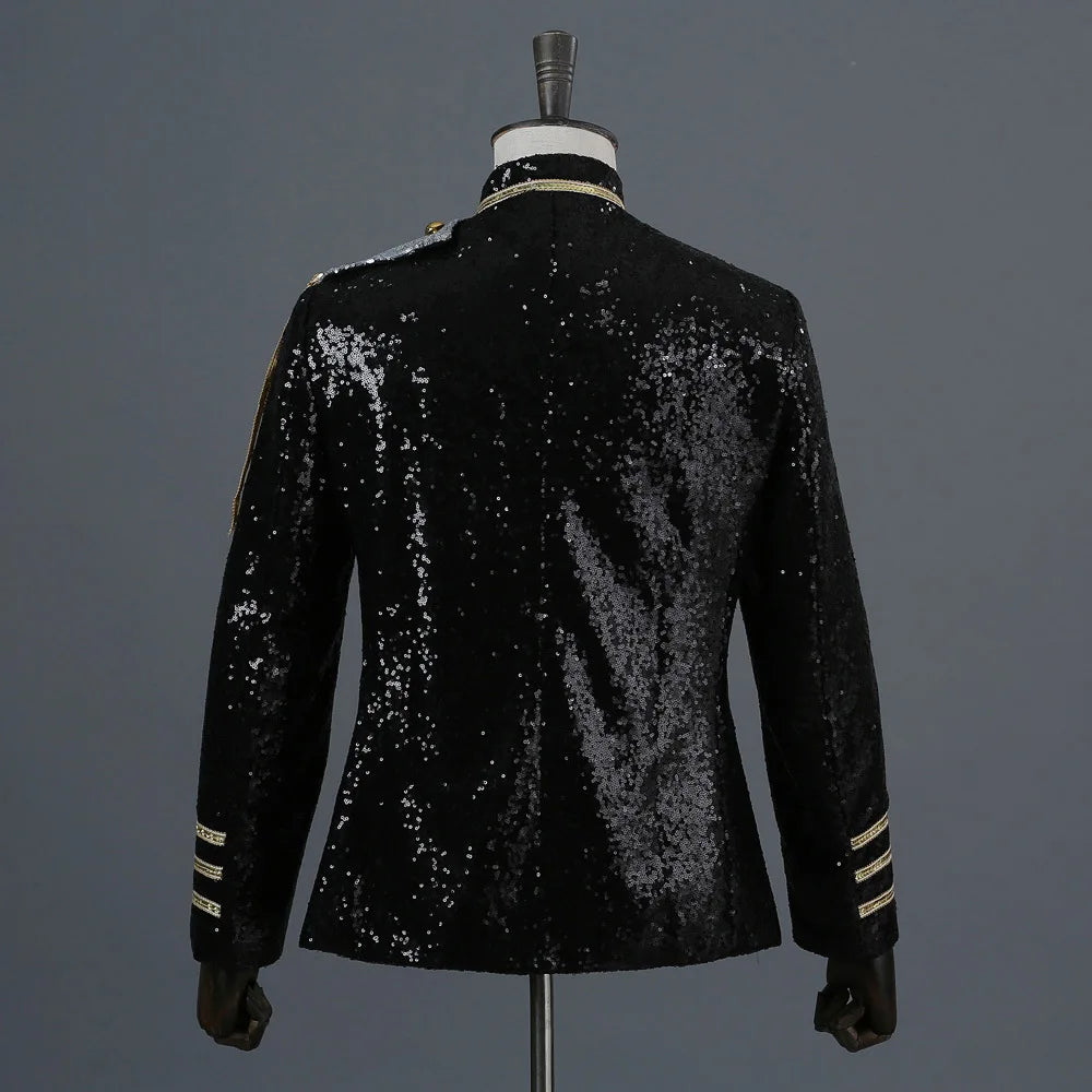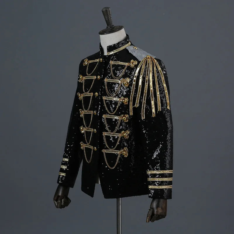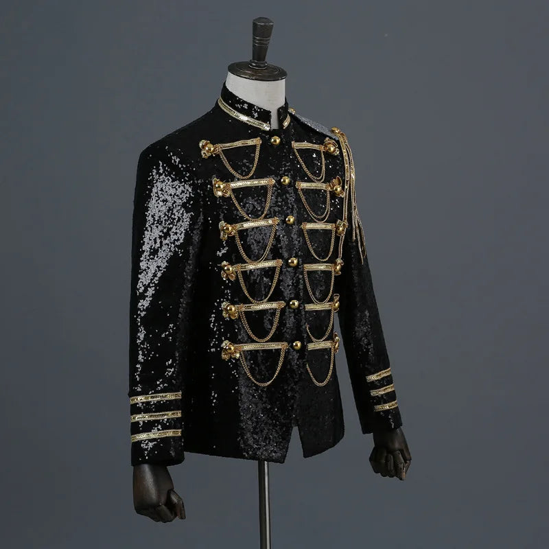 Chaqueta Negra de Lentejuelas con Cadenas y Detalles Dorados Estilo Metal