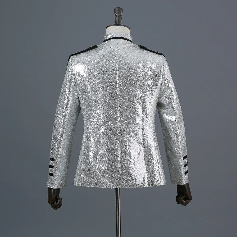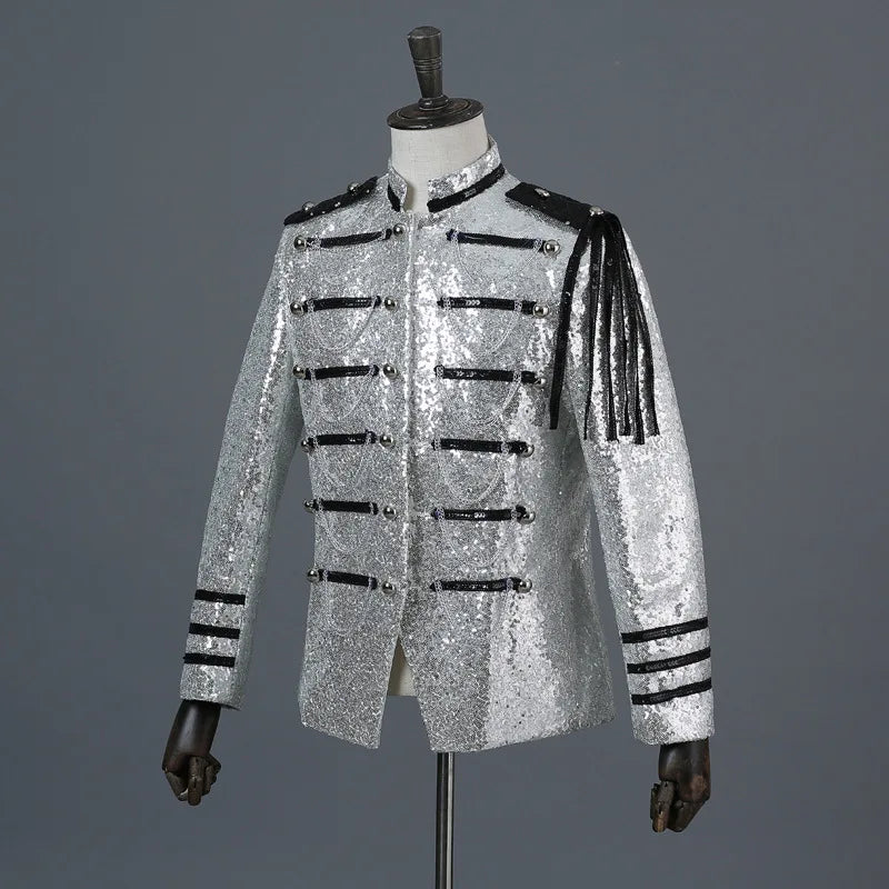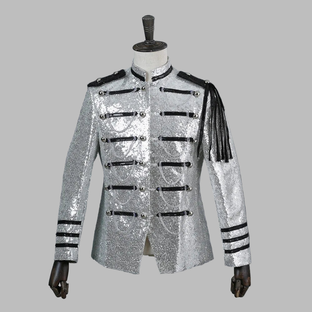 Chaqueta Plateada de Lentejuelas con Flecos Negros Estilo Militar Rock
