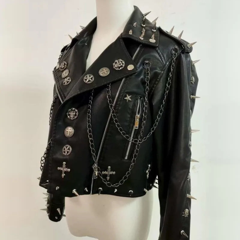Chaqueta Punk Negra con Tachuelas y Cadenas para Mujer Corta