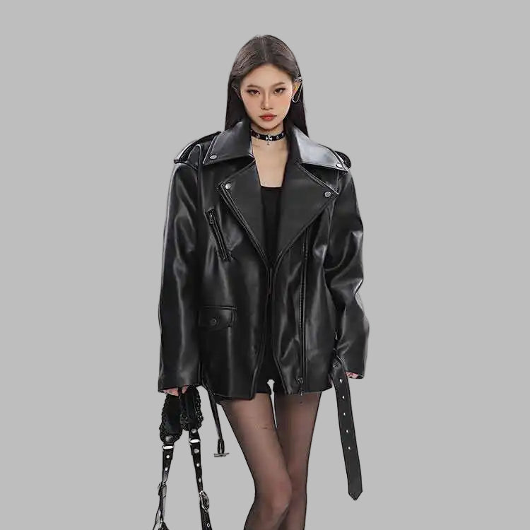 Chaqueta Vintage Larga de Cuero Negra Gótica Oversize para Mujer