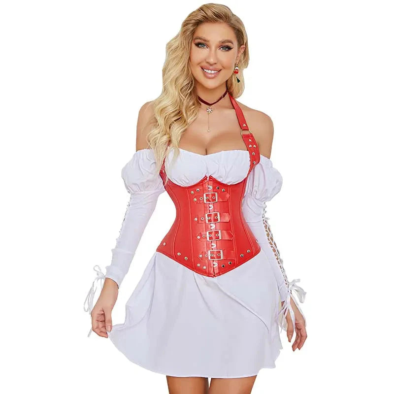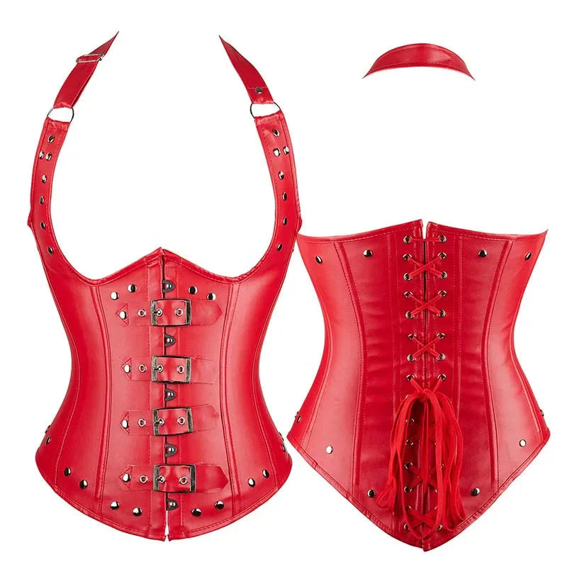 Gorset Damski z Czarnego Skóropodobnego Materiału – Gotycki Styl Wiktoriański czerwony