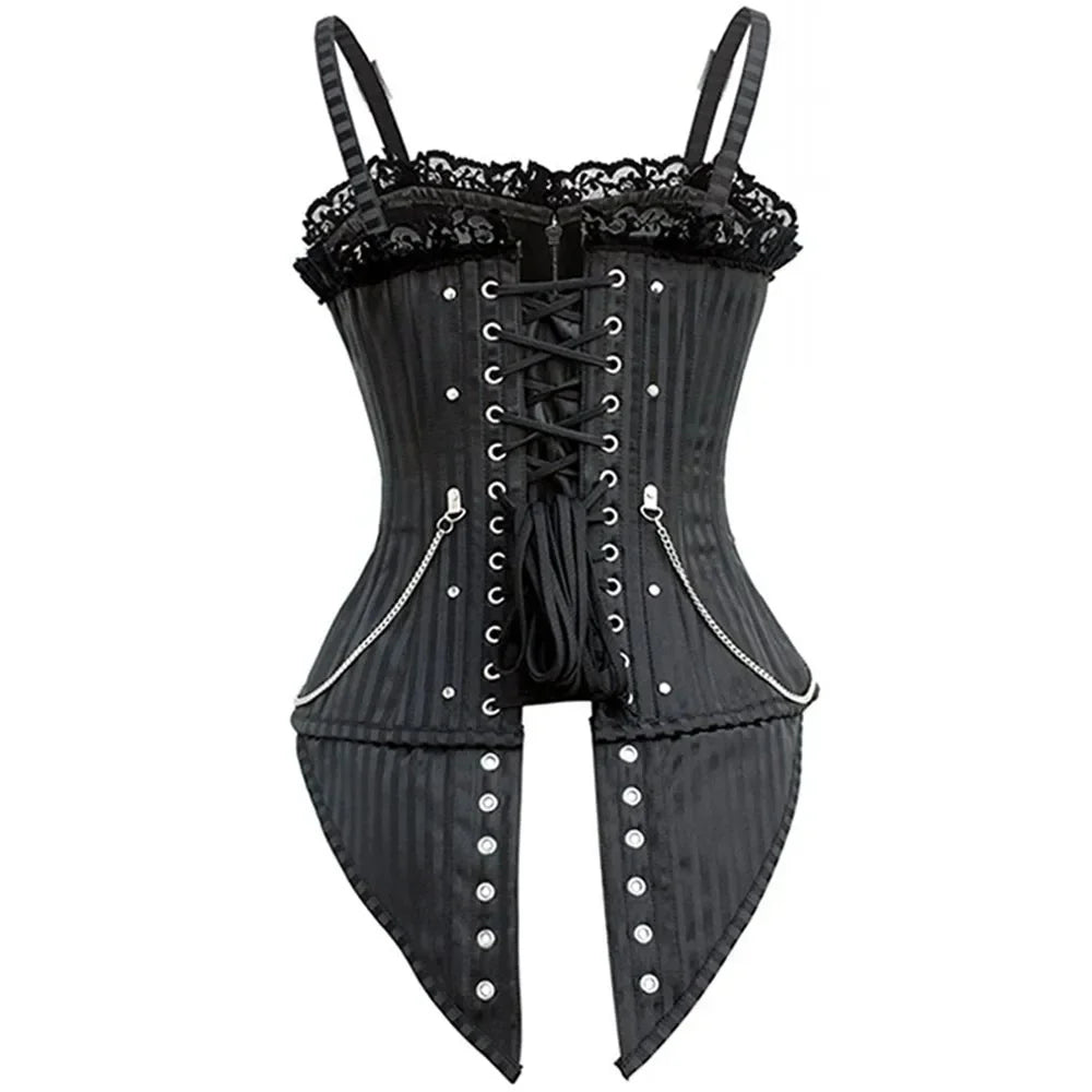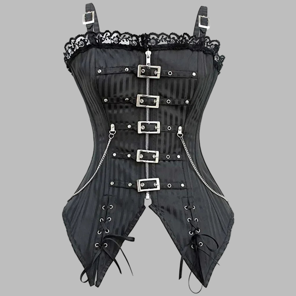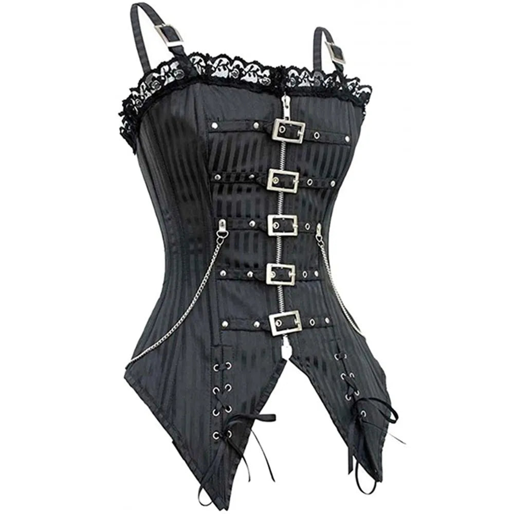 Corsé gótico punk negro con hebillas, tachuelas y cadenas a rayas