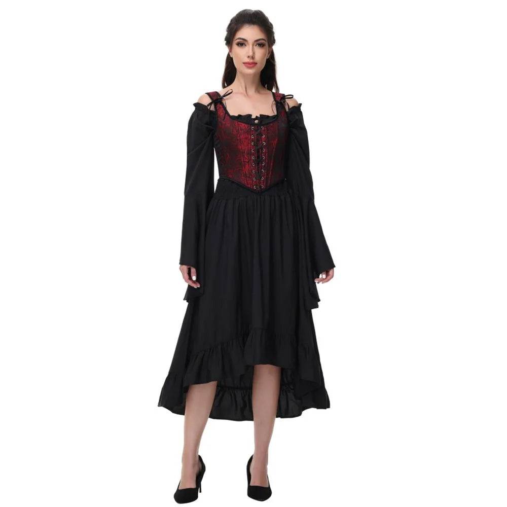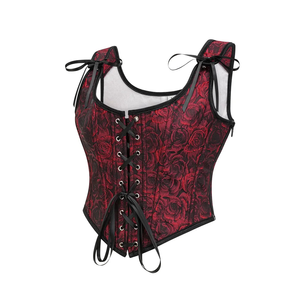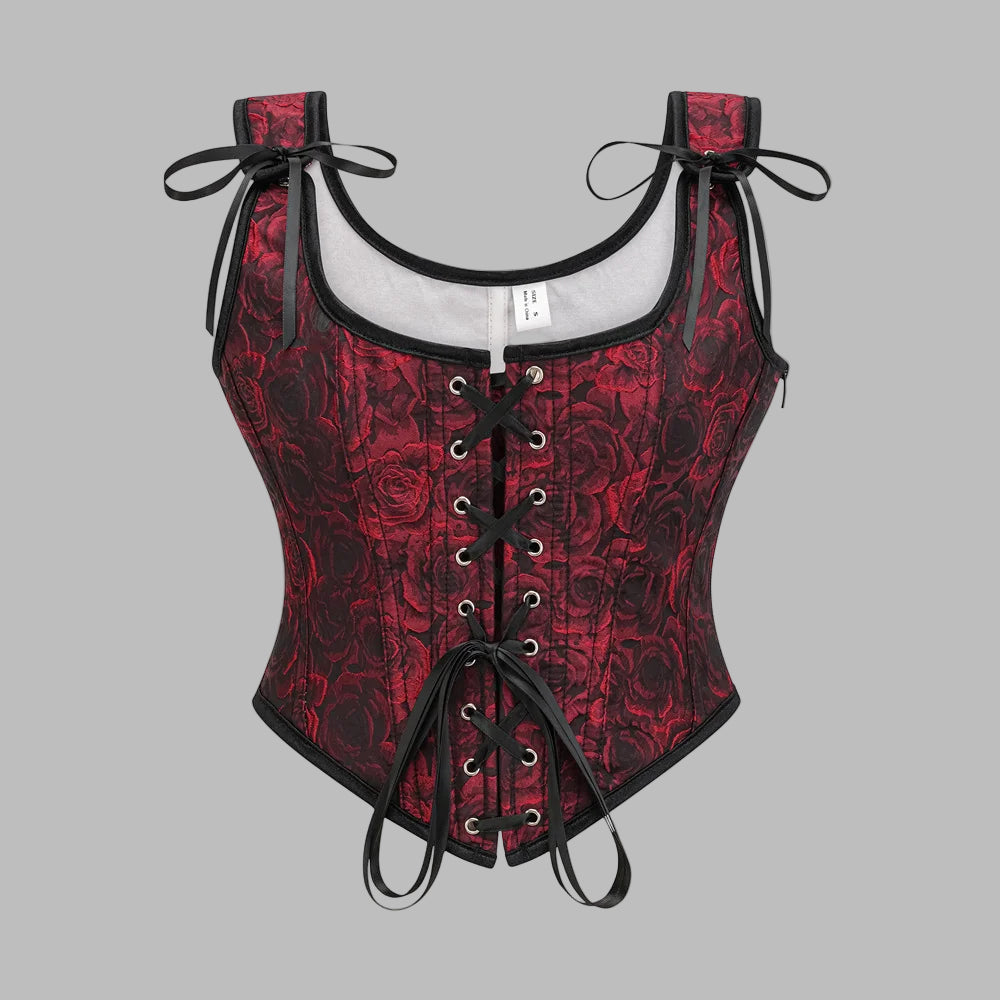 Corsé gótico rojo y negro con cordones y rosas con tirantes