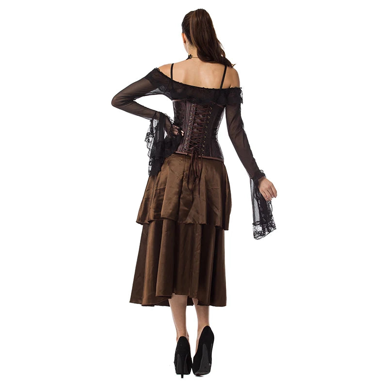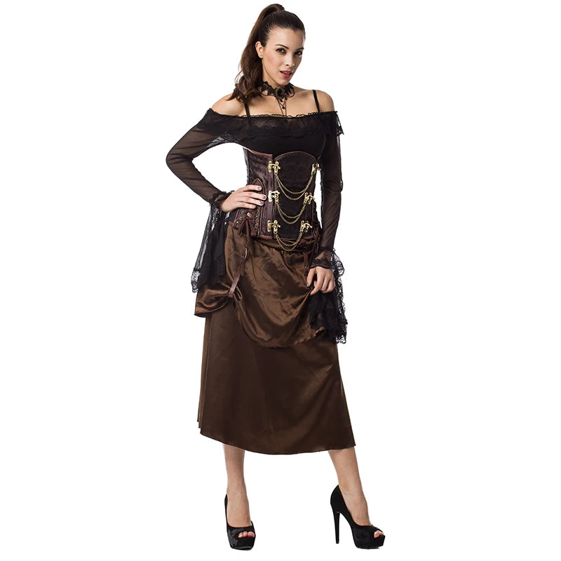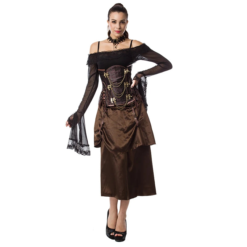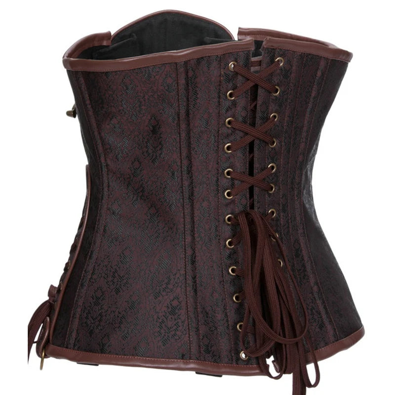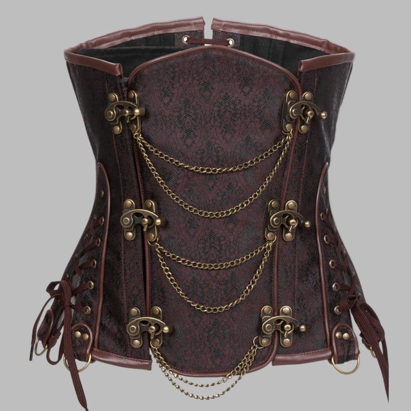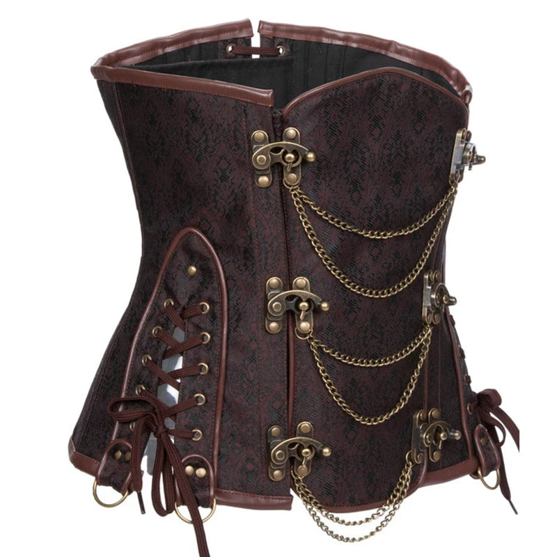 Corsé gótico steampunk marrón con cadenas y hebillas de latón