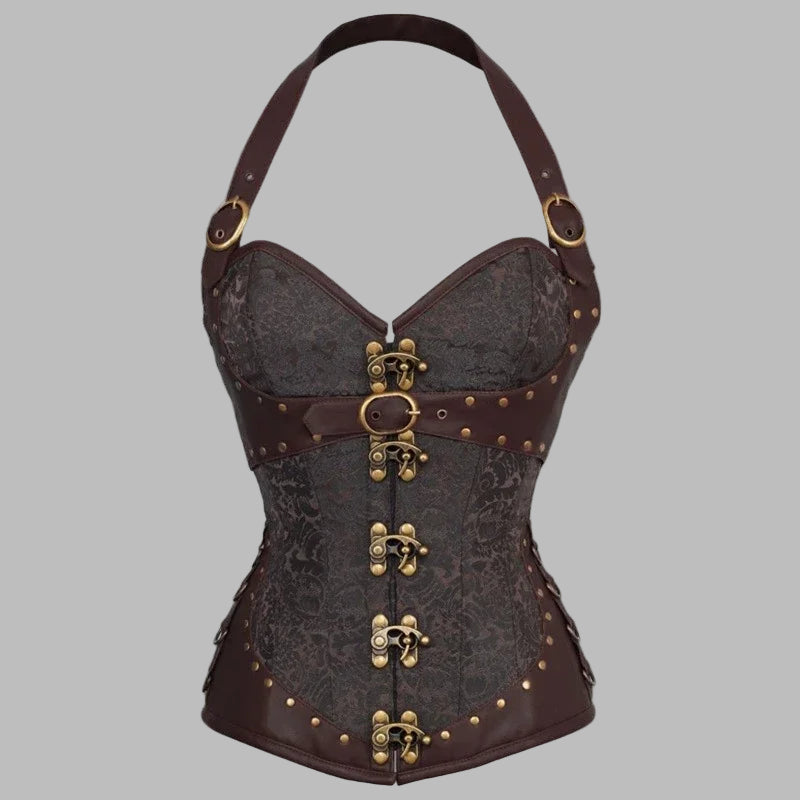 Corsé Steampunk Marrón con Diseño de Purpurina y Hebillas Metálicas para Mujer