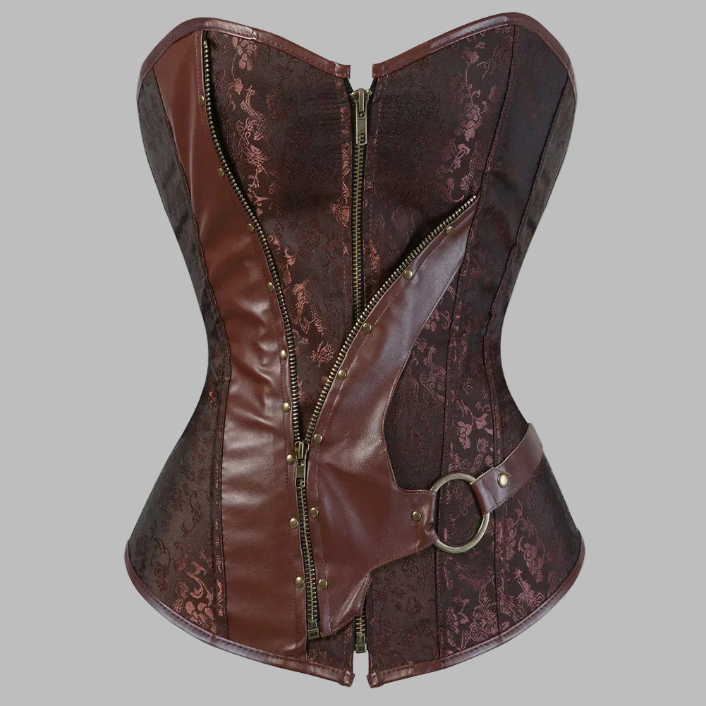 Corsé steampunk marrón de brocado con cremallera y cinturón con anillo