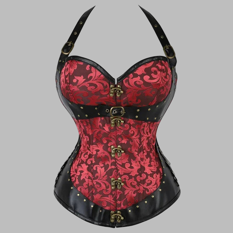 Corsé Steampunk Rojo de Brocado con Elementos de Cuero Negro y Hebillas