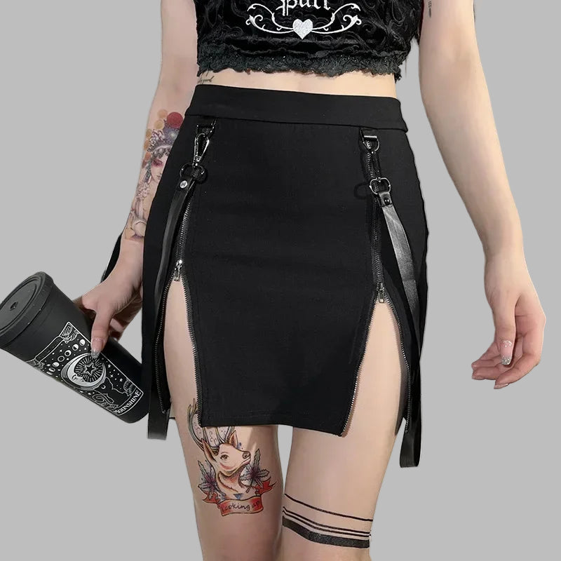 Falda gótica negra mini con cremalleras y correas straps