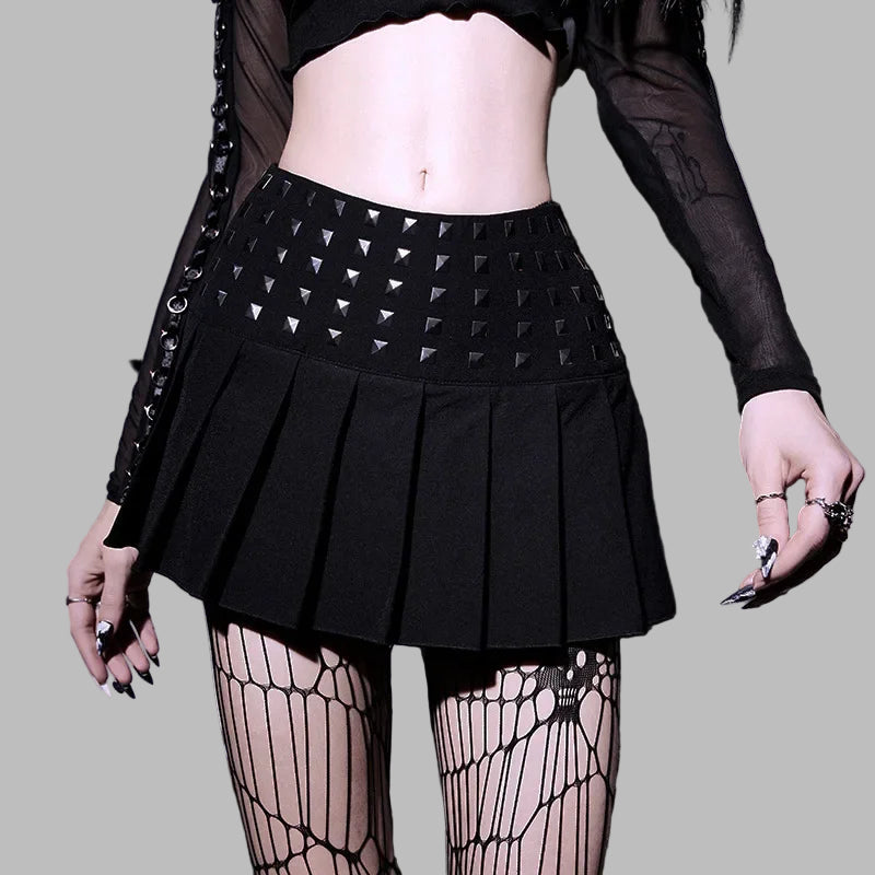 Falda Mini Negra con Tachuelas Plisada Grunge para Mujer