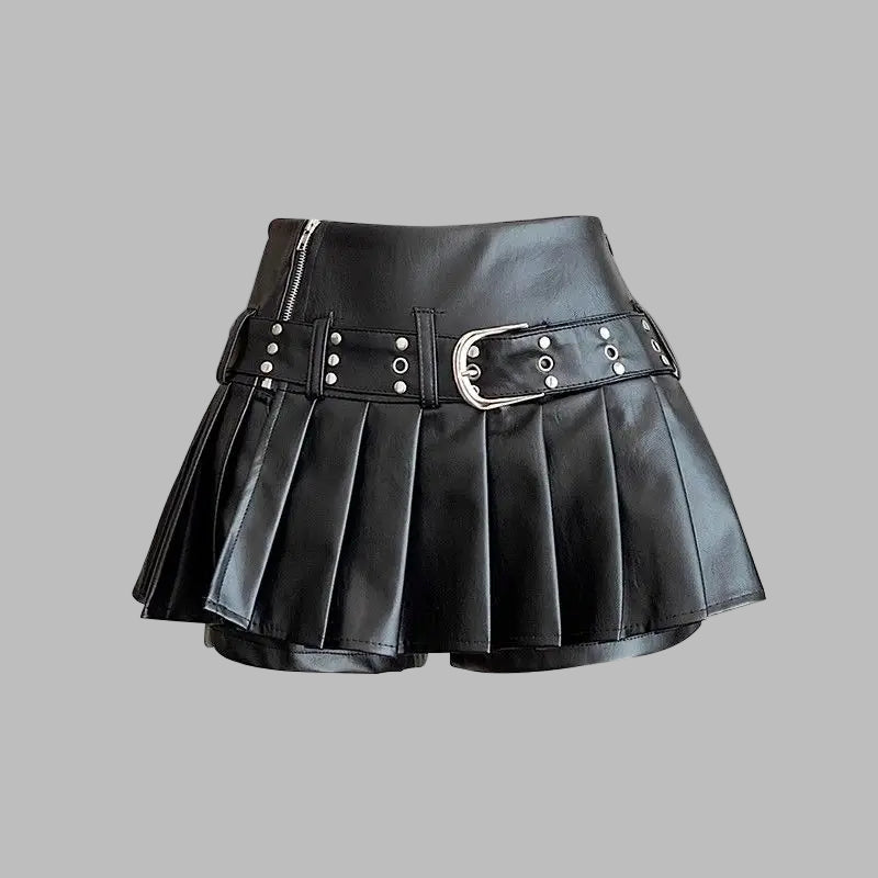 Falda Mini Negra de Cuero Plisada con Cinturón Metálico