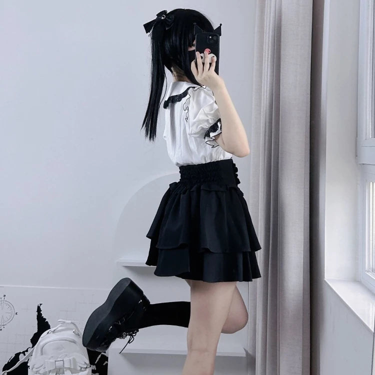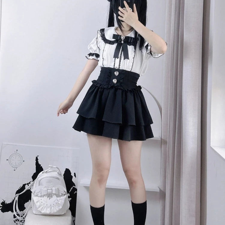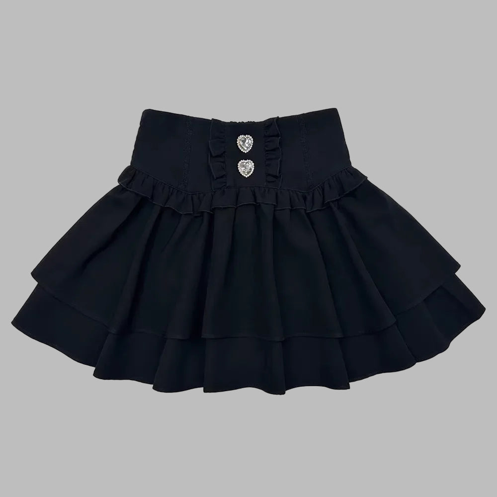 Falda Negra Jirai Kei con Volantes y Botones Decorativos