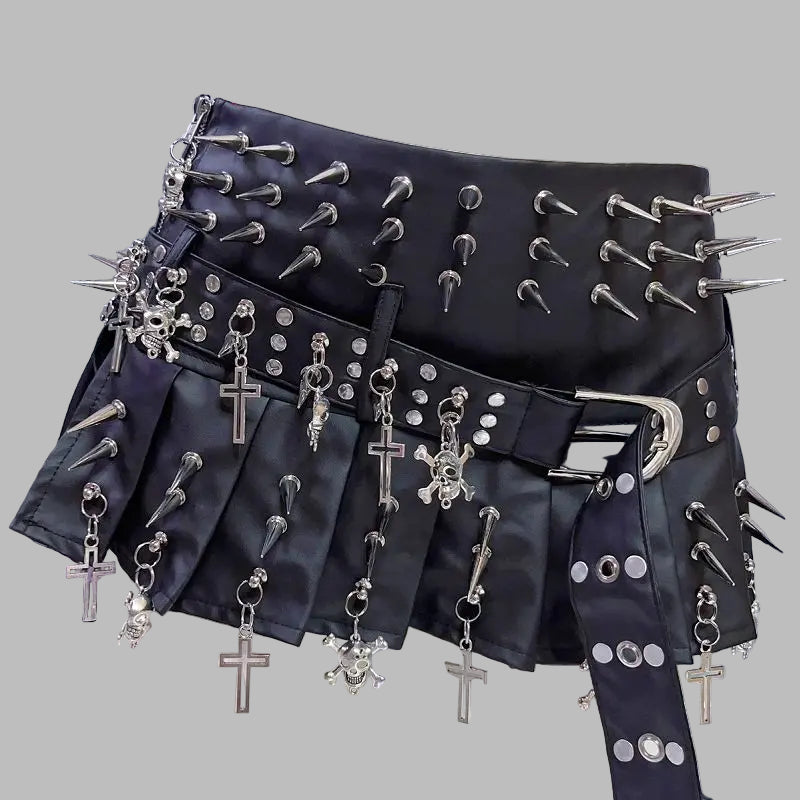 Falda Plisada Negra con Tachuelas y Cadenas Metal