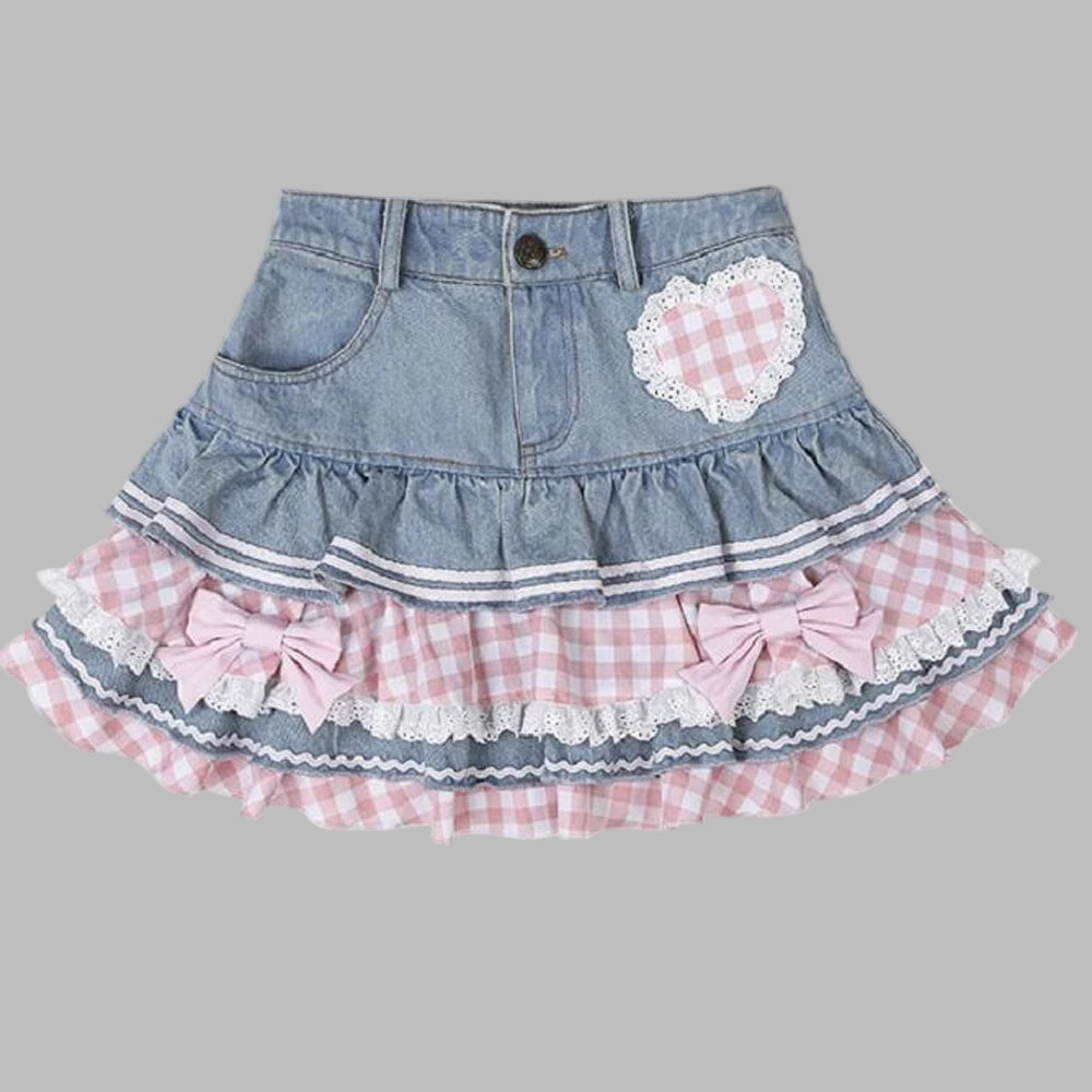 Falda Vaquera Jirai Kei con Cuadros Rosados y Lazos