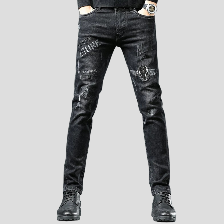 Punk Jeansy Czarne z Napisami i Skrzydłami