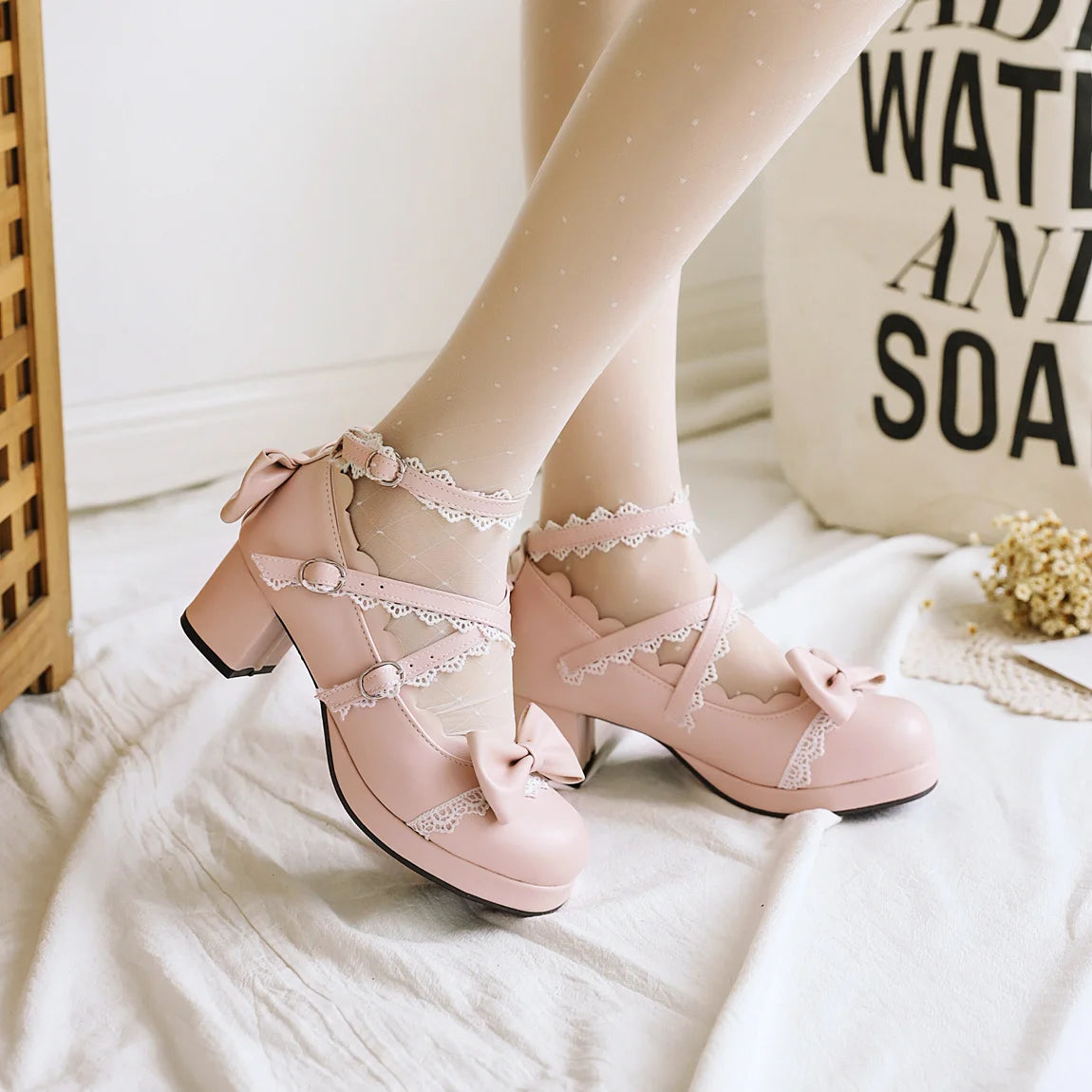 Jirai Kei Mary Jane rosas con encaje y triple correa
