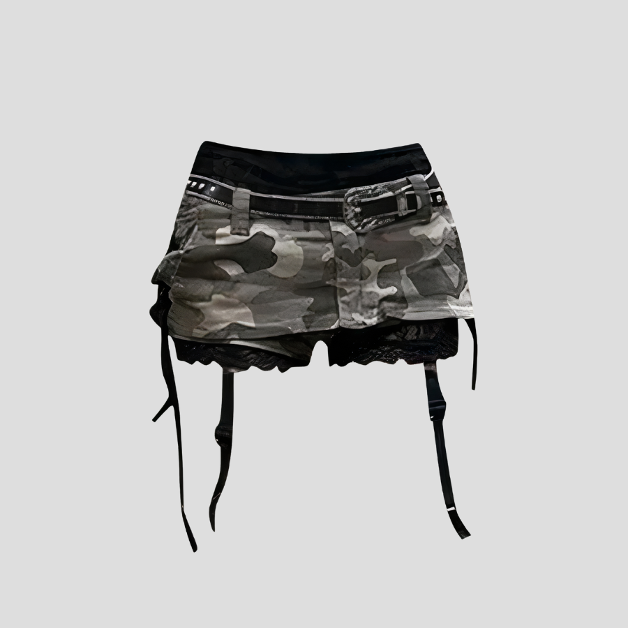 Pantalones cortos punk de camuflaje con encaje y cinturón para mujer
