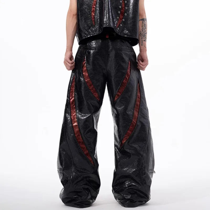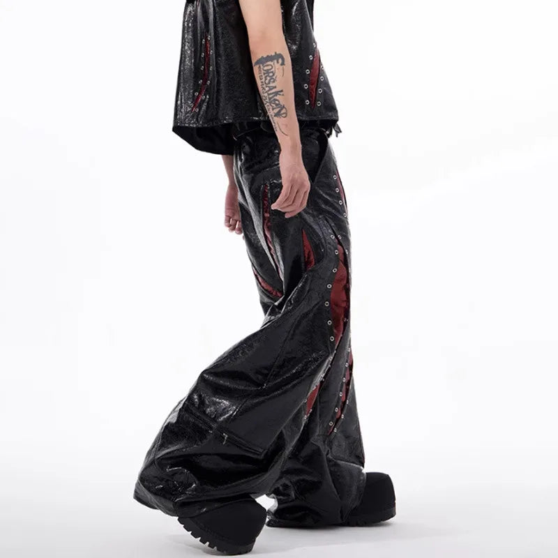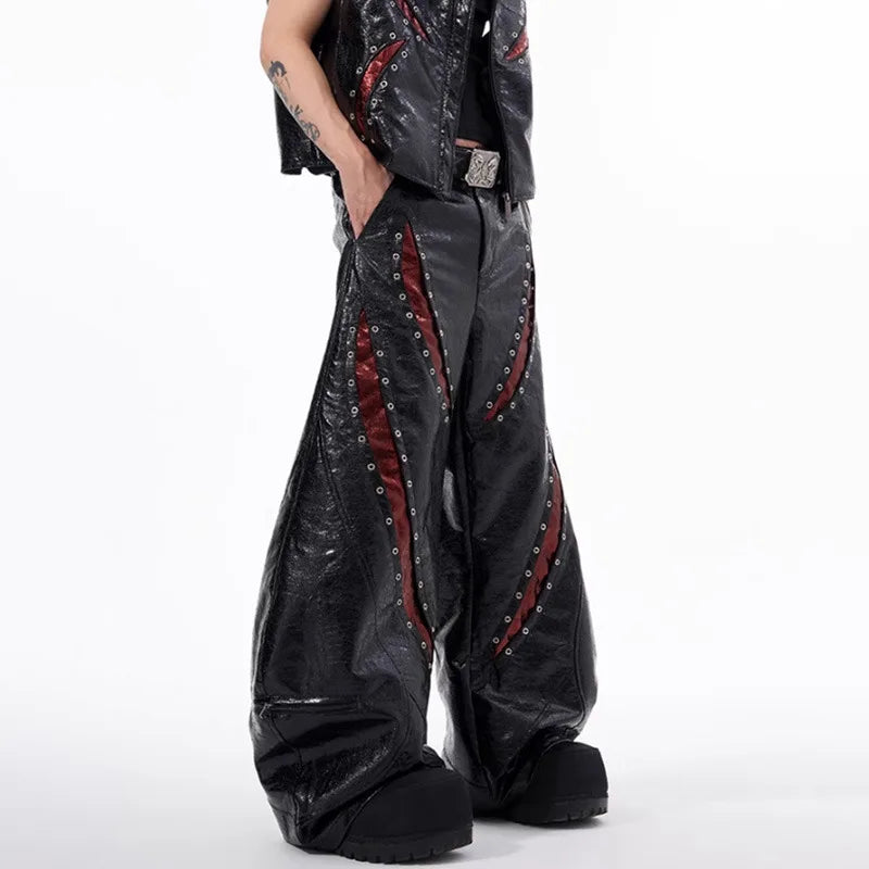 Pantalones de cuero negros estilo steampunk con franjas burdeos y tachuelas