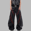 Pantalones de cuero negros estilo steampunk con galones burdeos y tachuelas