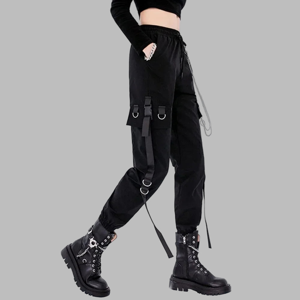 Pantalones Punk Negros con Aros Metálicos y Correas Tácticas