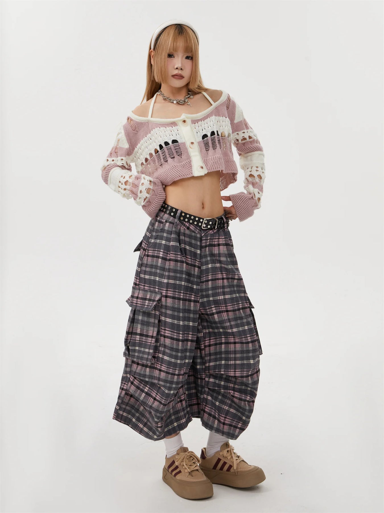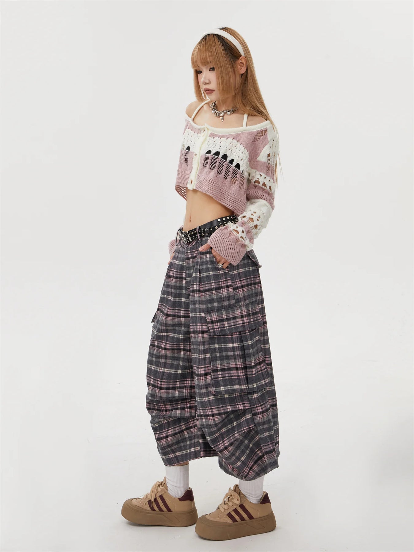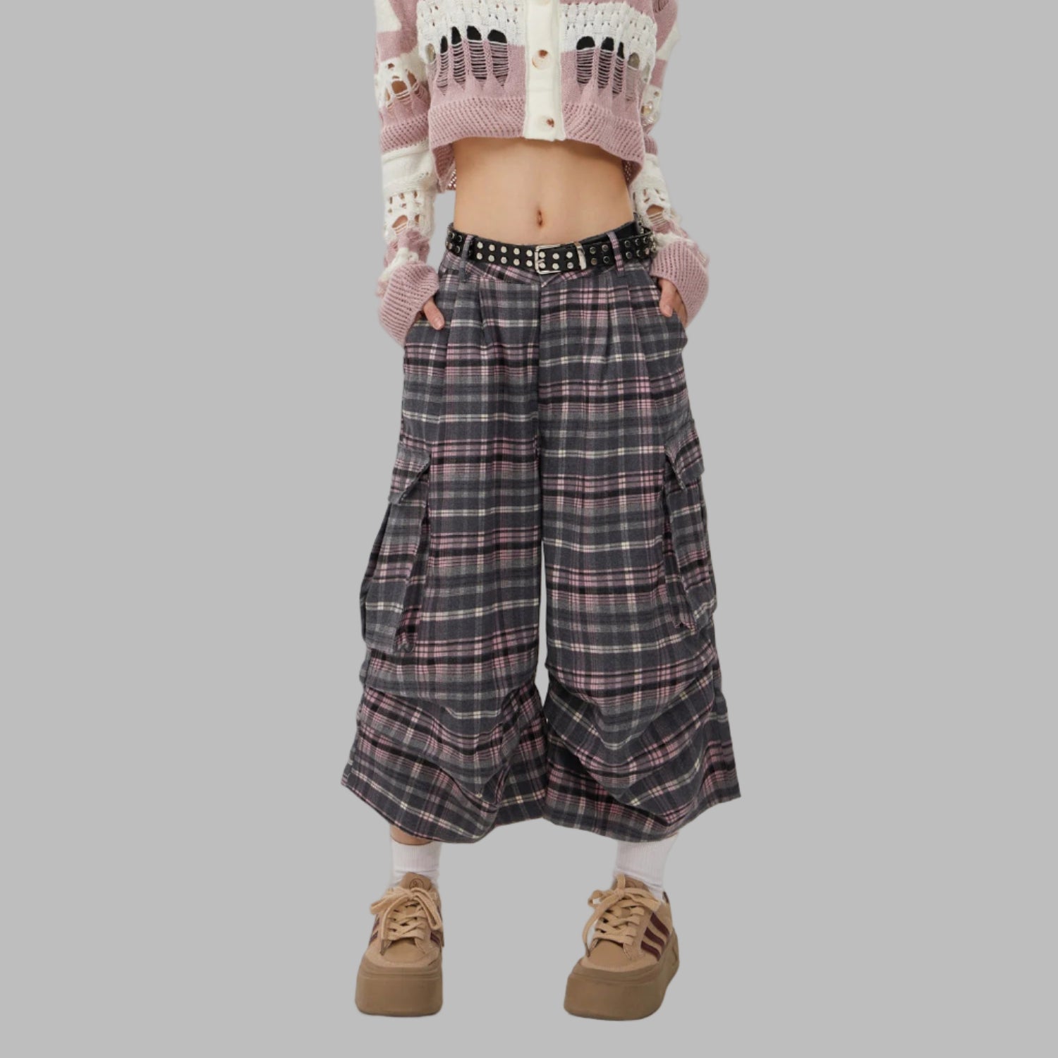 Pantalones Punk Rock de Cuadros con Encaje Gris-Rosa Ver opciones