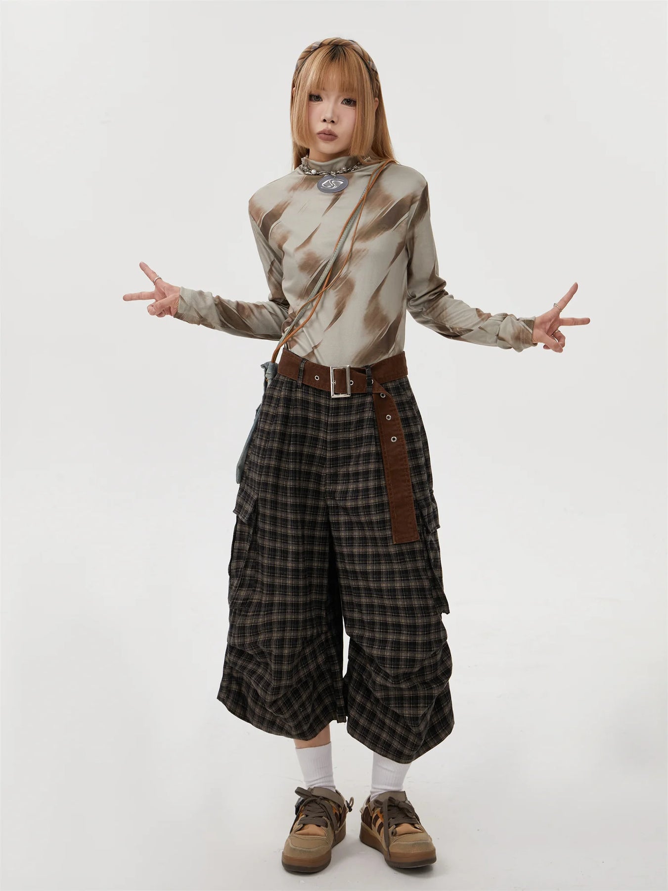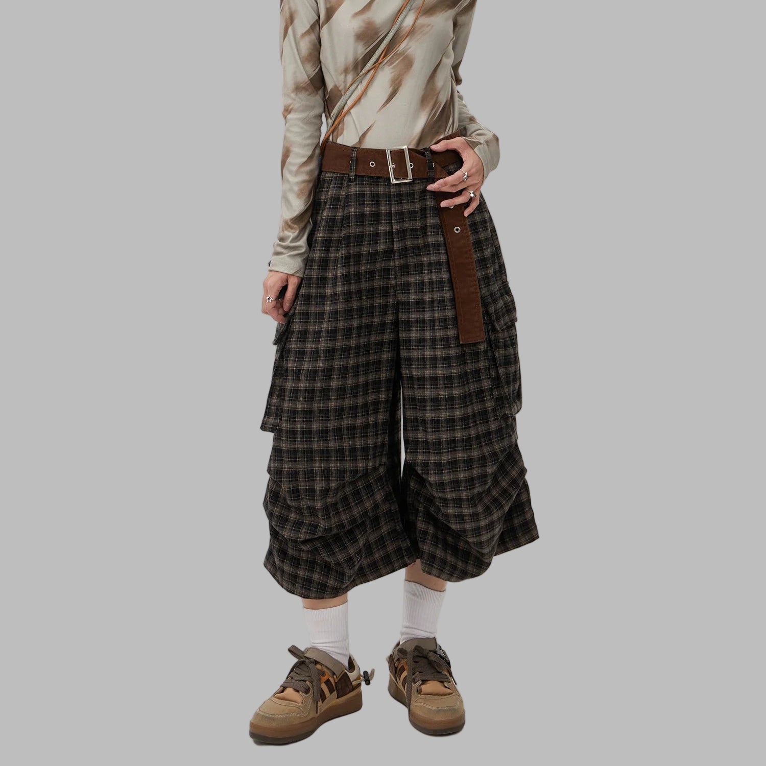 Pantalones Steampunk de Cuadros con Cinturón Khaki Vintage