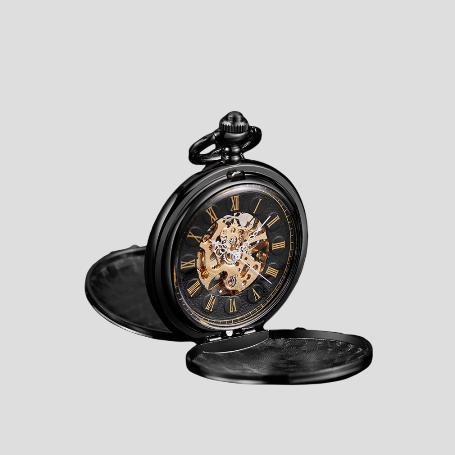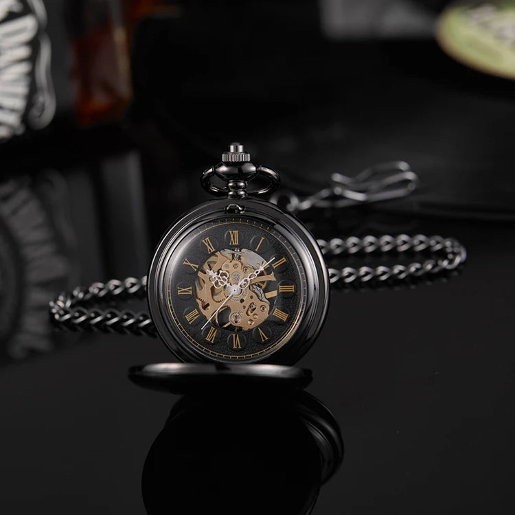 Reloj de Bolsillo Steampunk Mecánico Negro con Detalles Dorados