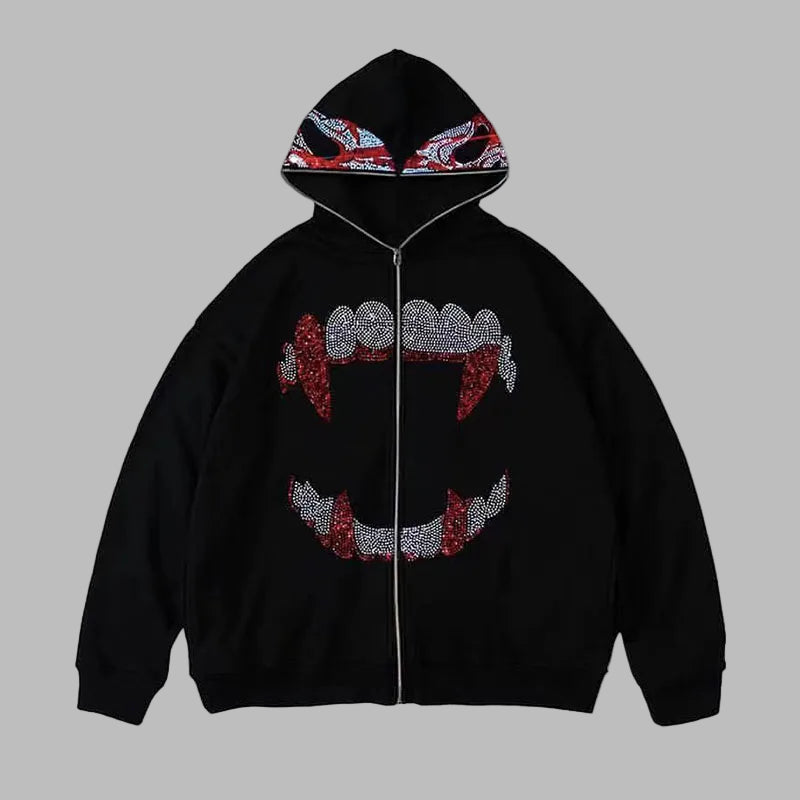Sudadera con cremallera negra gótica de mujer con colmillos de vampiro