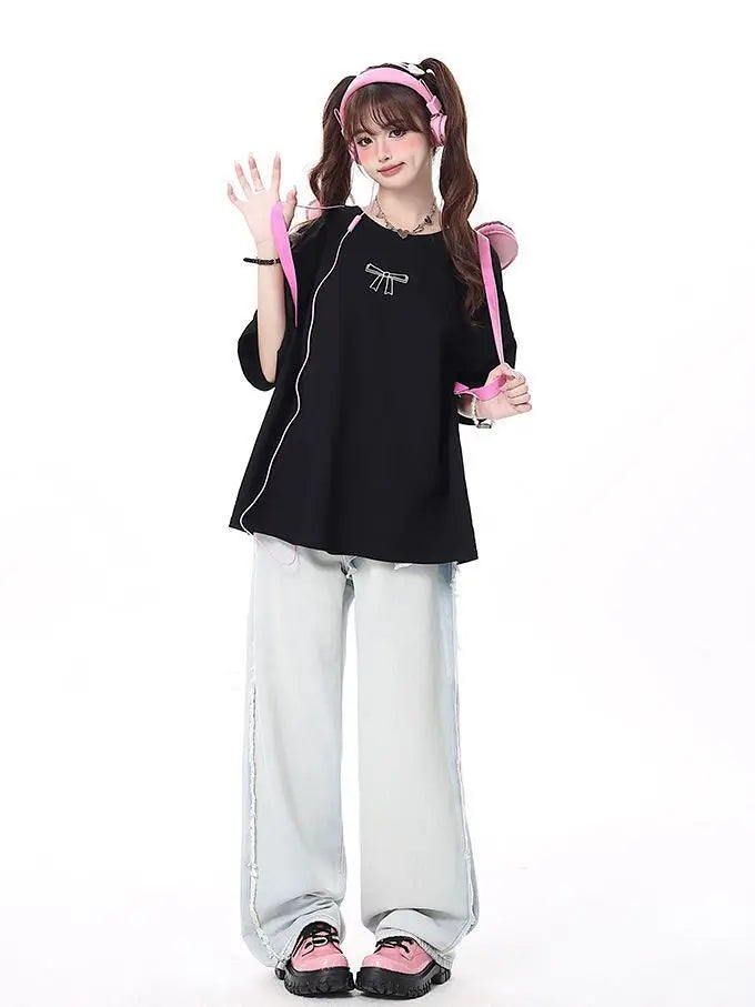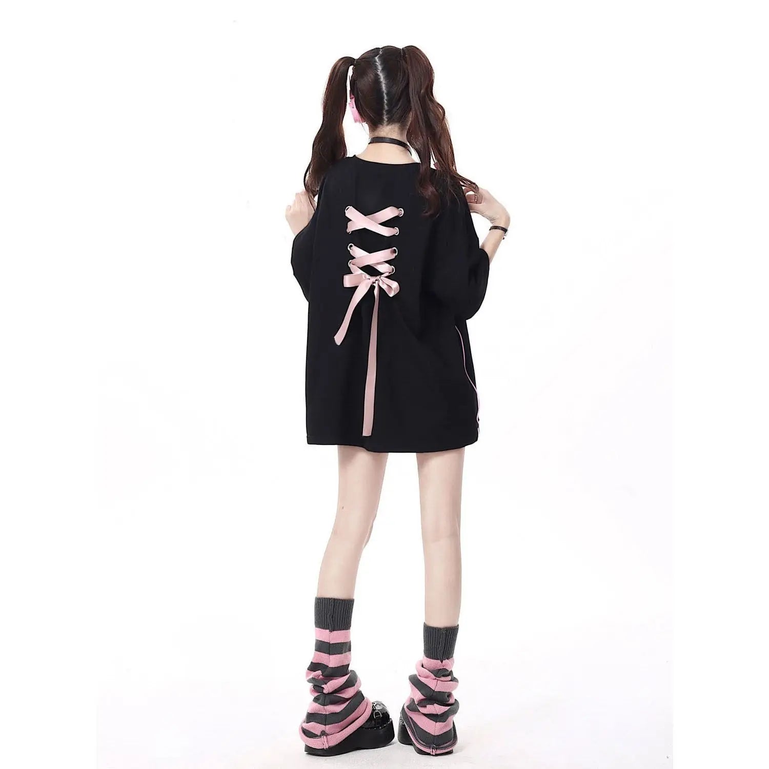 Sudadera Jirai Kei Negra con Cordones en la Espalda y Lazo Rosa