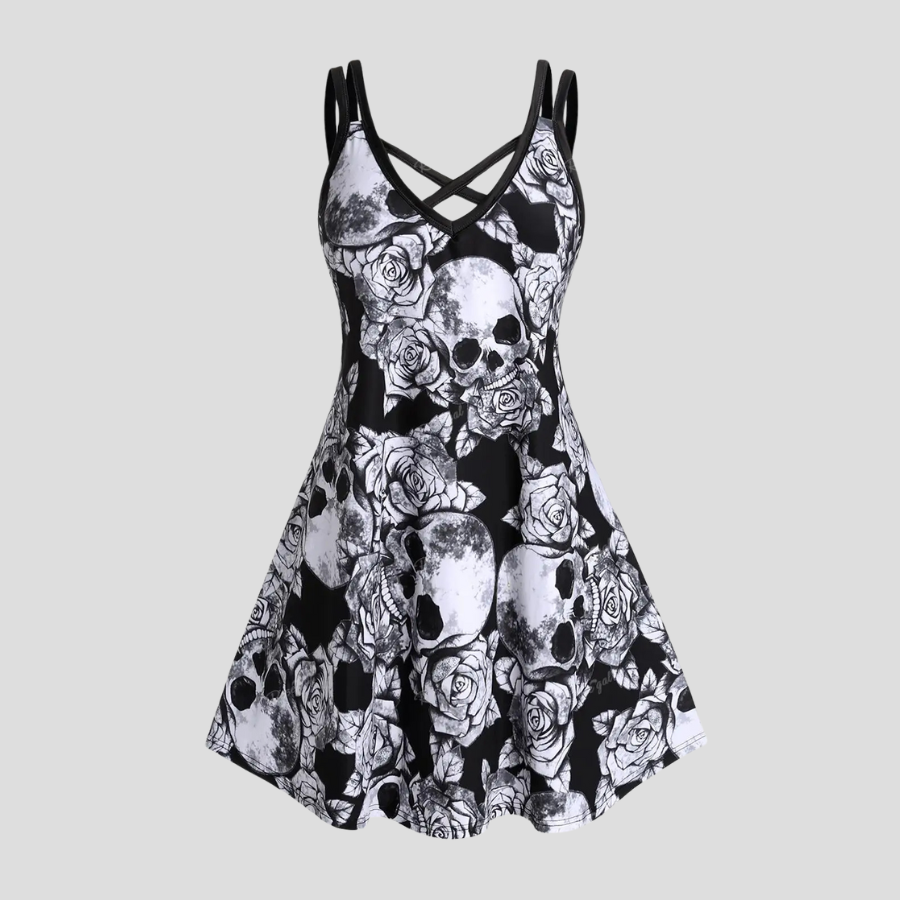 Vestido Blanco Rock con Calaveras y Rosas Metal