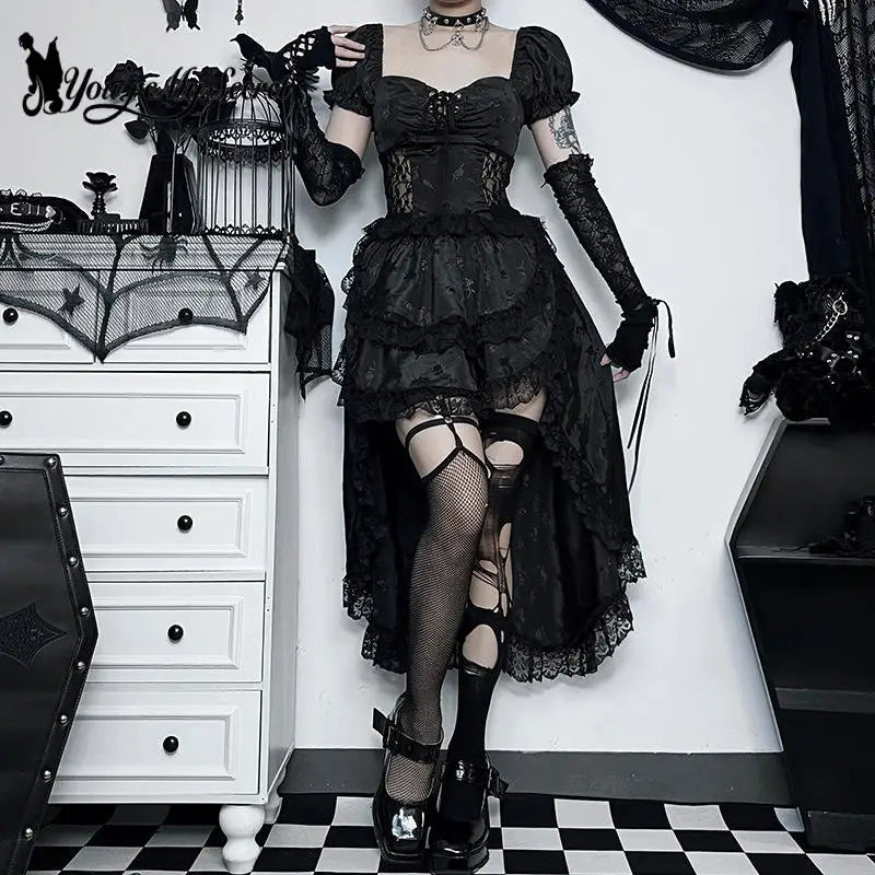 Vestido Asimétrico Negro de Encaje Gótico Punk