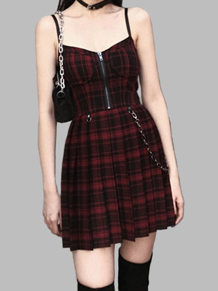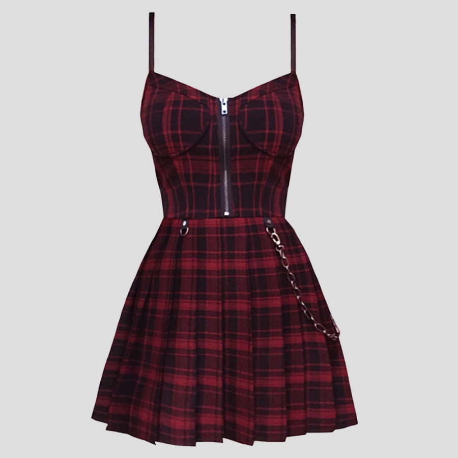 Vestido Grunge Punk Burdeos a Cuadros con Cadena