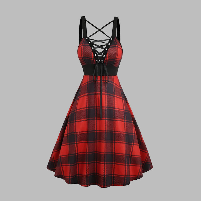 Vestido Punk Grunge de Cuadros con Cordones en la Espalda