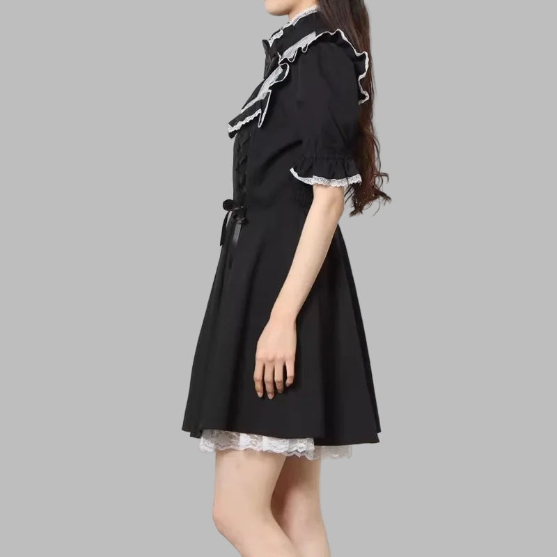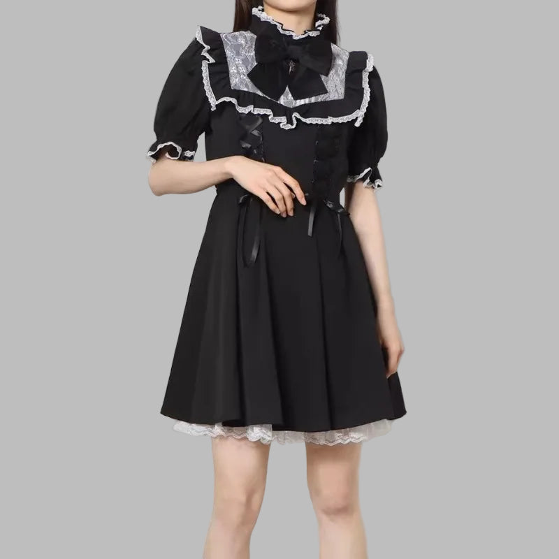 Vestido Jirai Kei Negro con Lazo de Encaje y Cordones