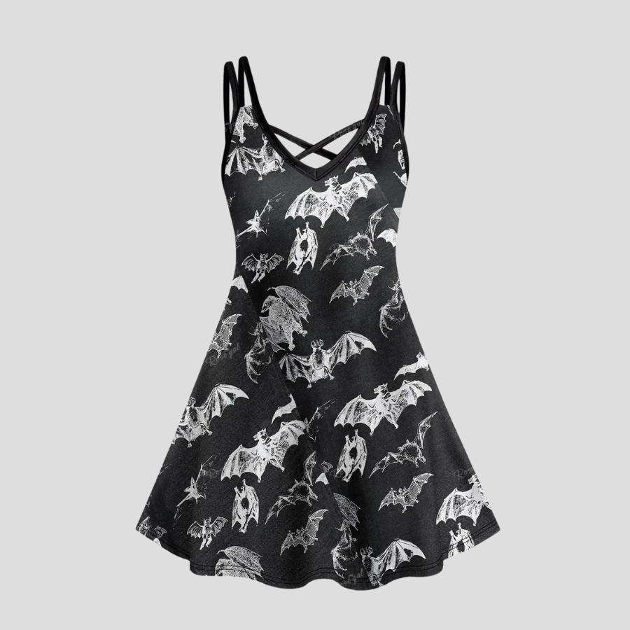 Vestido Negro Metal con Murciélagos y Tirantes Cruzados