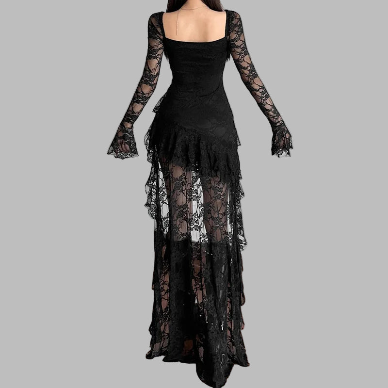 Vestido Negro Rock con Encaje y Bajo Asimétrico
