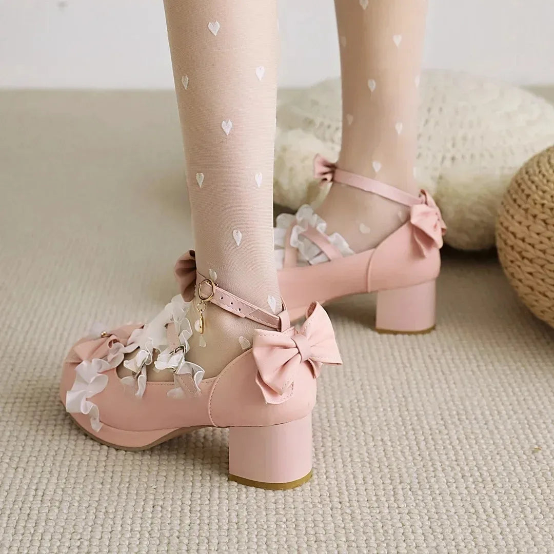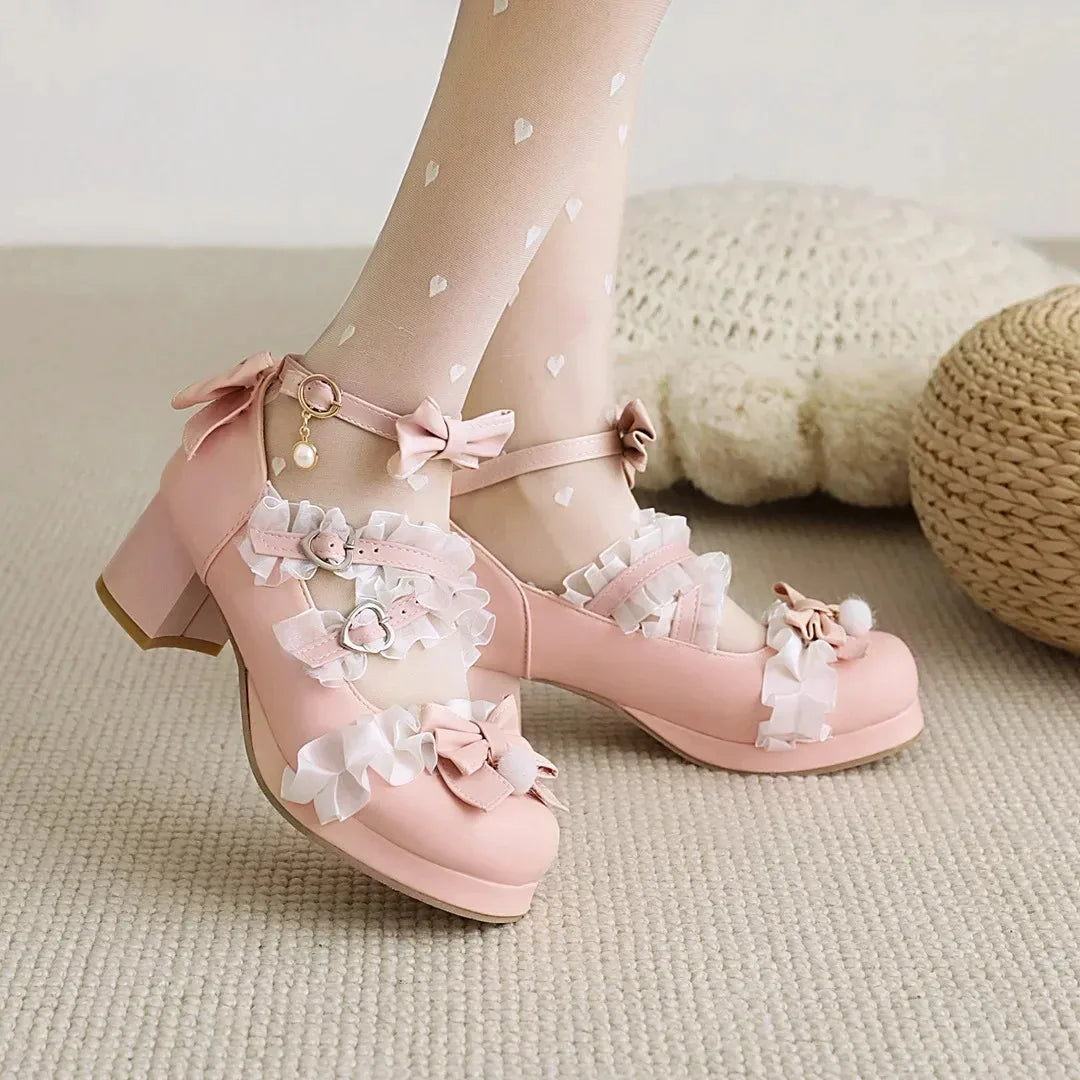 Zapatos de Plataforma Rosados con Volantes y Lazos Jirai Kei
