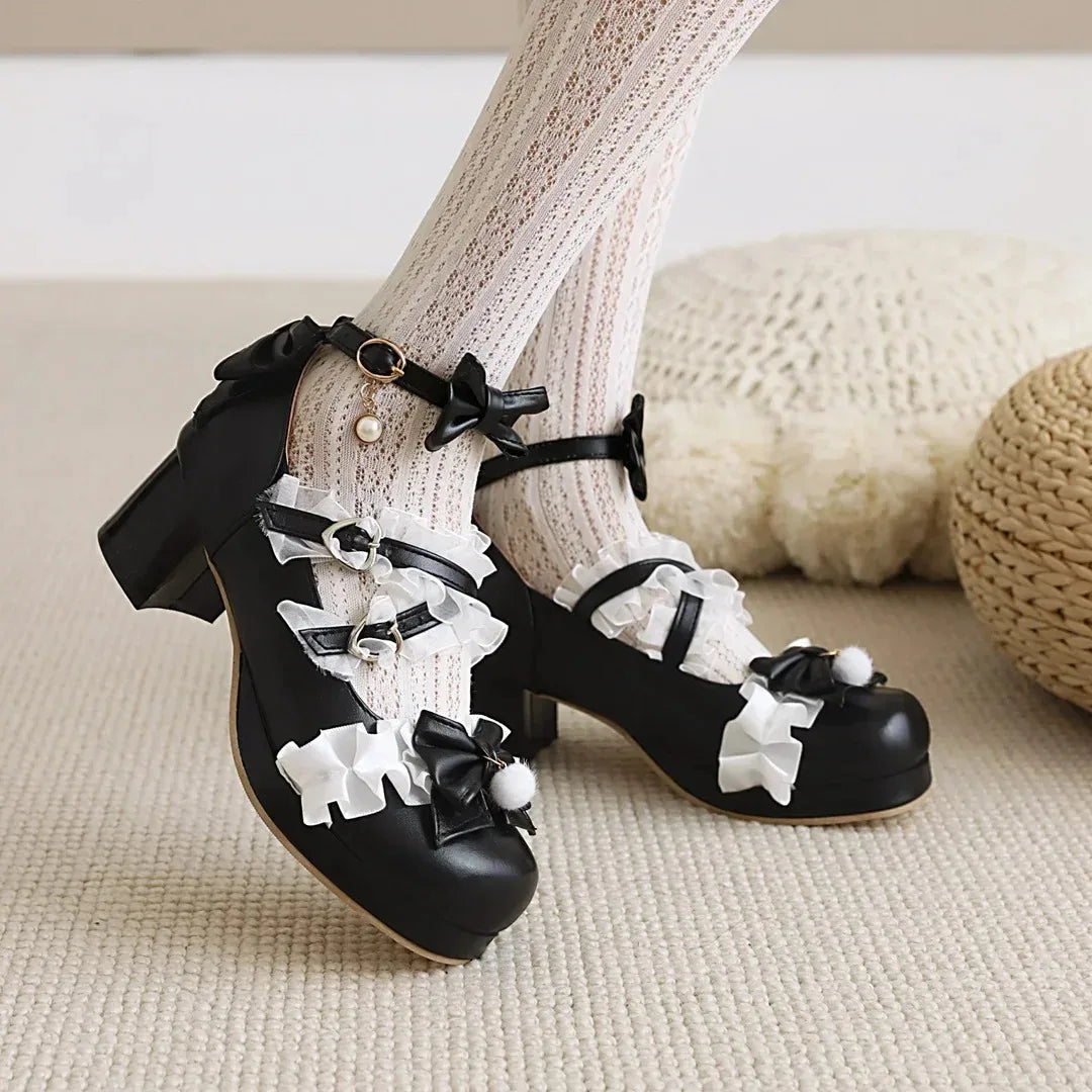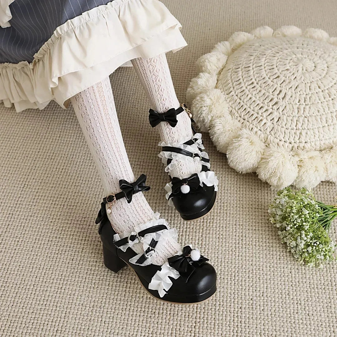 Zapatos Negros de Tacón con Lazos y Volantes Jirai Kei